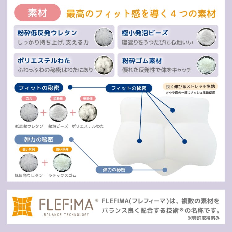 【生地 】 (表面・裏面前方部)ナイロン 90% ポリウレタン 10%(裏面後方部)ポリエステル100%【詰め物 】 (頭部)ポリスチレンビーズ・ポリウレタンフォーム・ポリエステル わた(首部)ラテックスゴム素材・ポリウレタンフォーム【カバー 】 レーヨン 95% ポリウレタン 5%