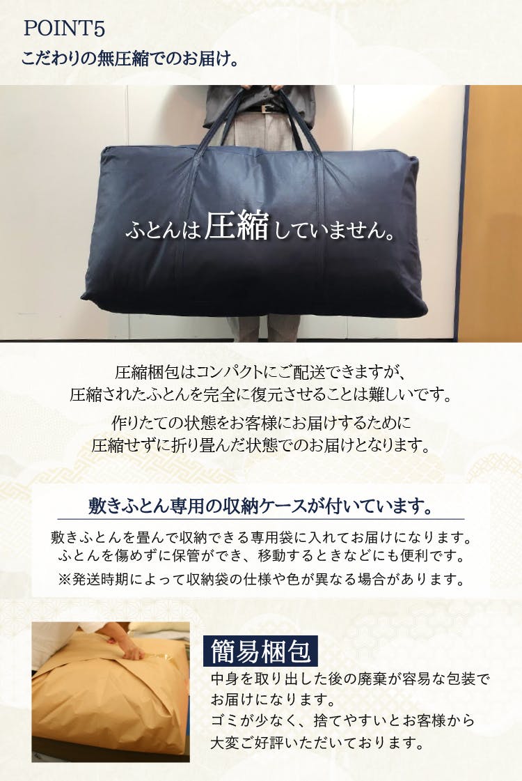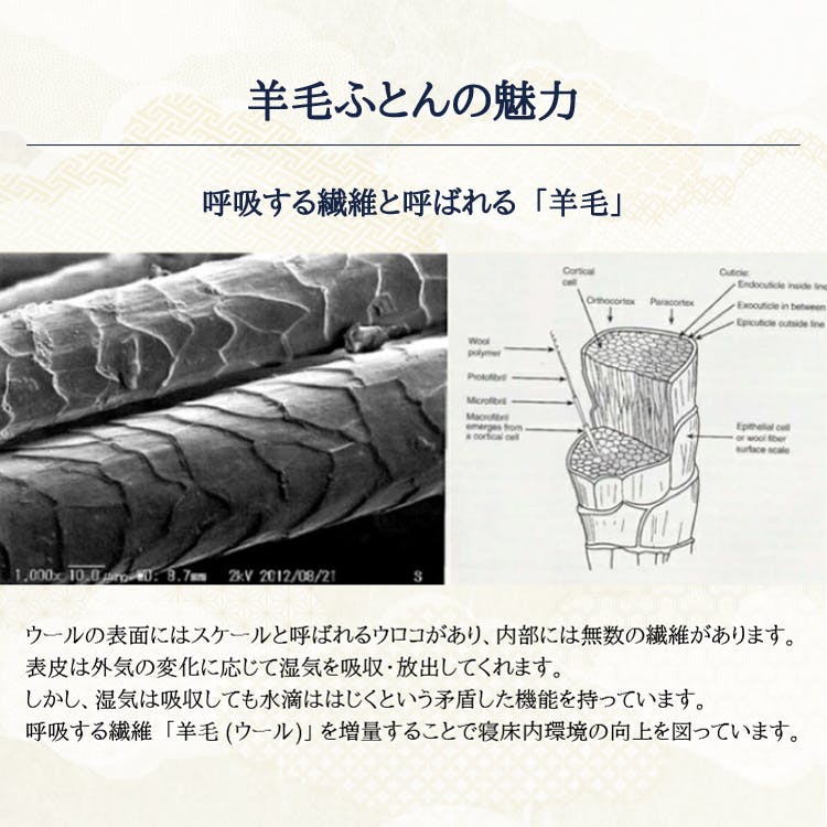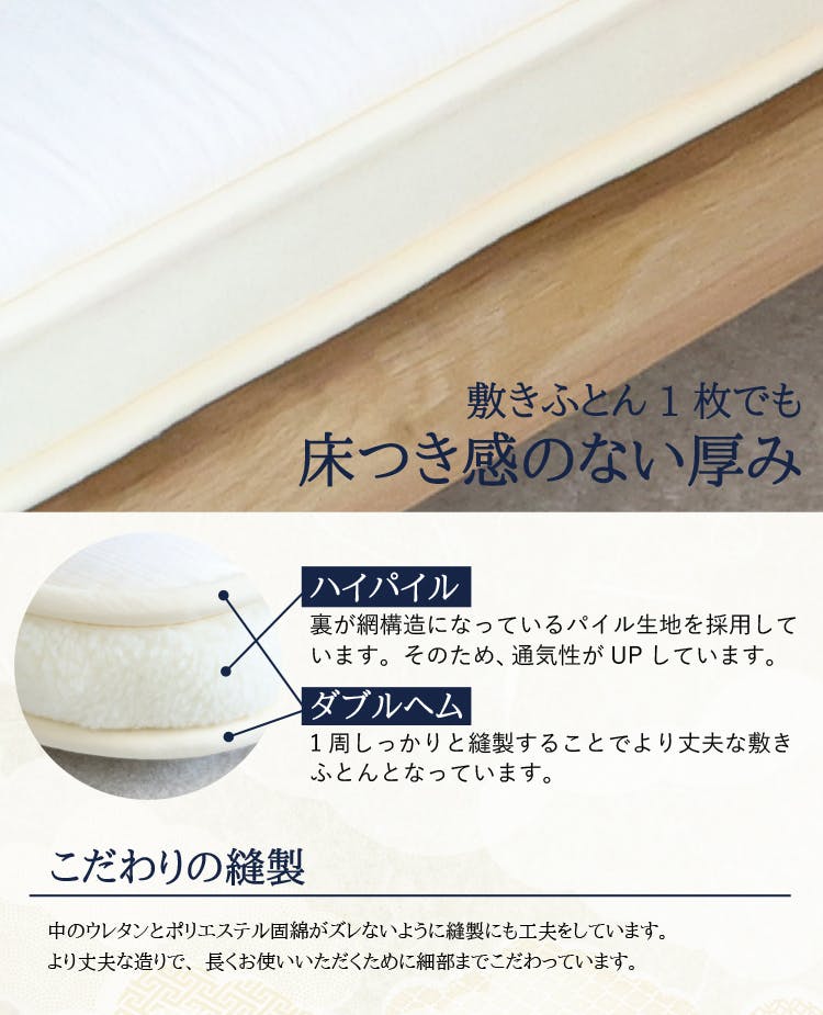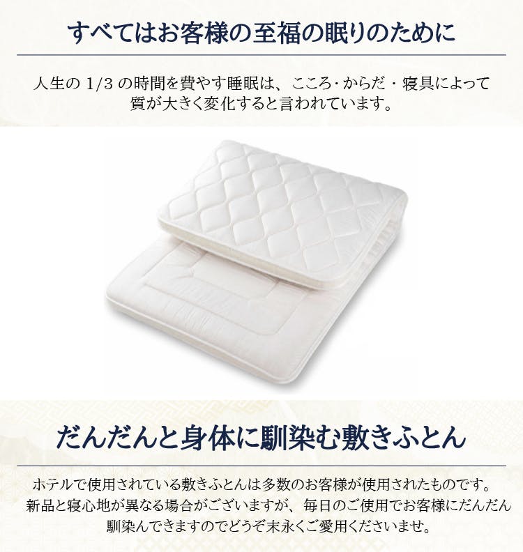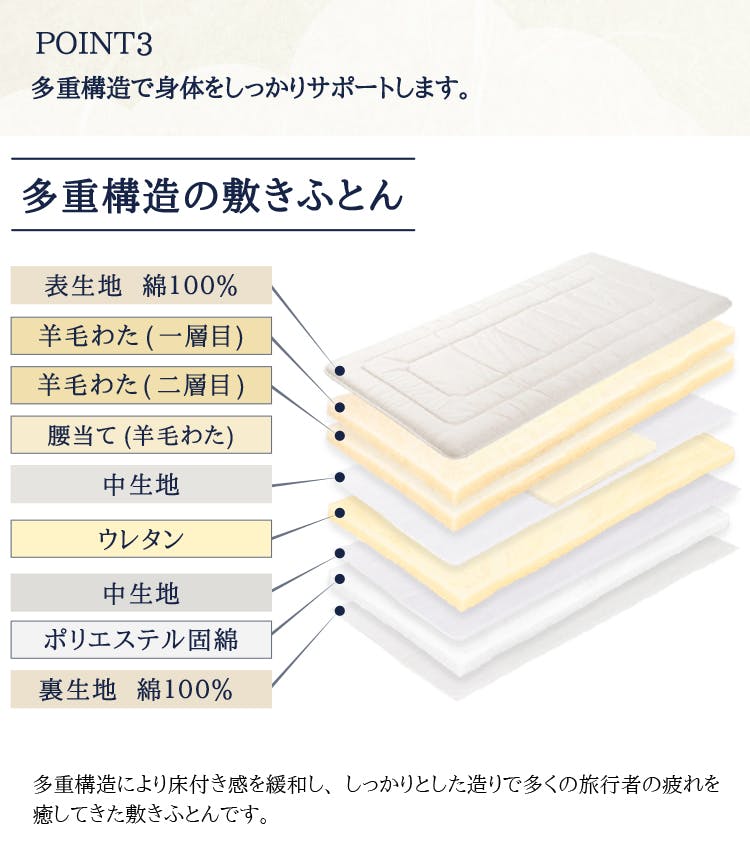 寝心地・造り・耐久性などで評価され全国のホテルや旅館で永く愛用されている敷布団です。三層羊毛敷布団は、多くの有名旅館で現役です。ご宿泊された際に確認されたラベルを元にご購入頂くことが多い商品です。羊毛は、夏涼しく・冬は温かく。しっかりとした造りと多重構造により床つき感を緩和。畳での使用はもちろんベッドのマットレスとしてご利用いただいているお客様も。人生の1/3の時間を費やす睡眠は、こころ・からだ・寝具によって質が大きく変化すると言われています。