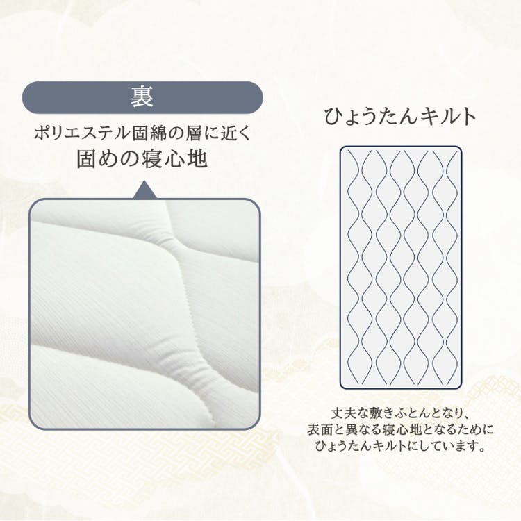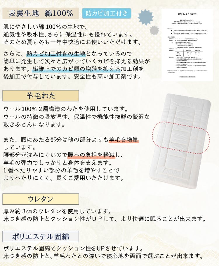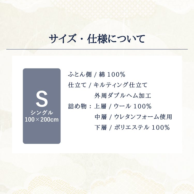 材質:ふとん側/綿100%詰め物:上層/ウール100% 中層/ウレタンフォーム 下層/ポリエステル100%仕立て:キルティング仕立て・外周ヘム加工