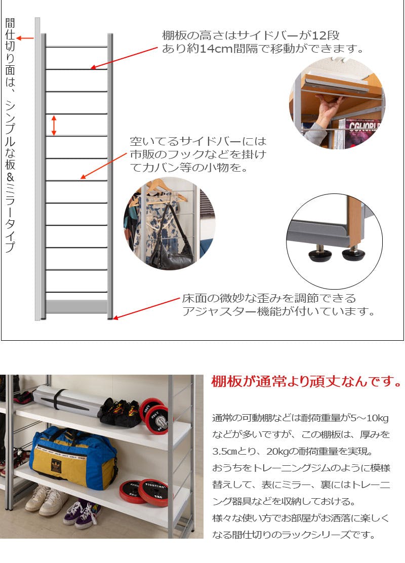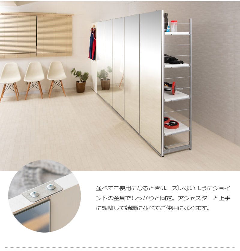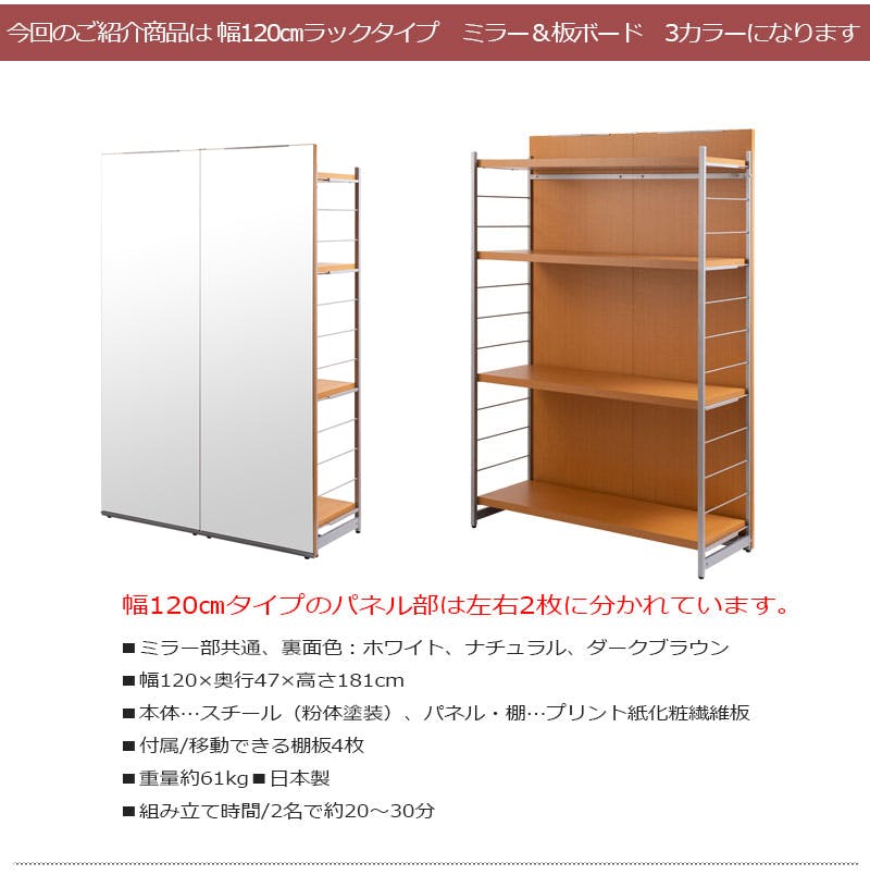 ■商品サイズ/本体:(約)幅120×奥行47×高さ181cm、ラダー間隔 :(約)14cm、ミラー:3mm厚■棚板/可動式4枚(14cmピッチ12段)■耐荷重量/棚板:(約)20kg■商品重量/(約)61kg■日本製■組立品(組立時間:2名で約30分)