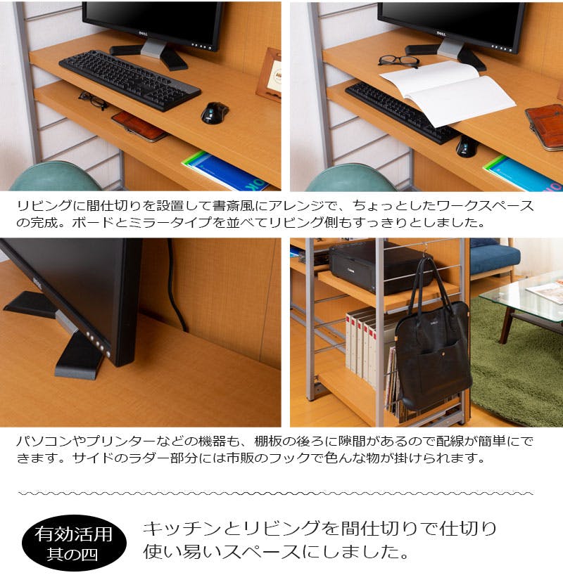 ■商品の仕様/フレーム:スチール(エポキシ粉体塗装)、棚板・ボード :プリント紙化粧繊維板、ミラー