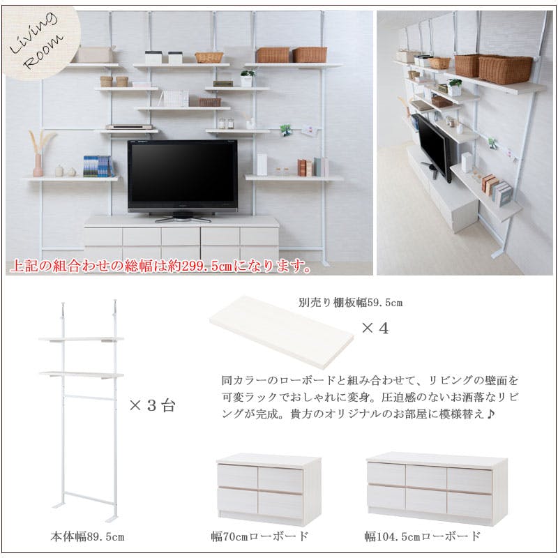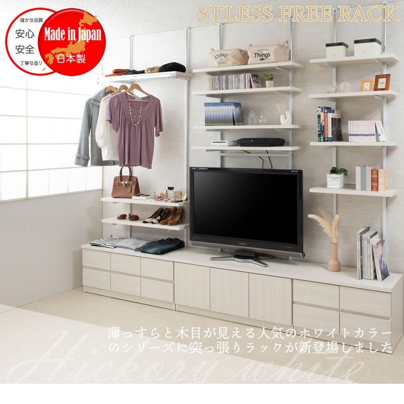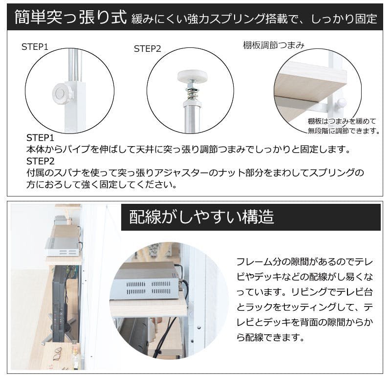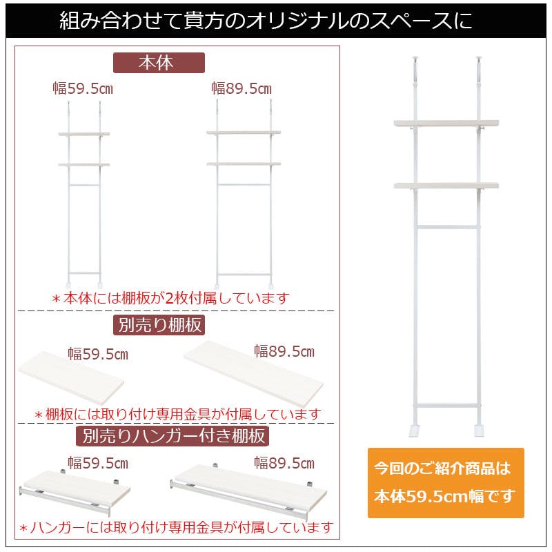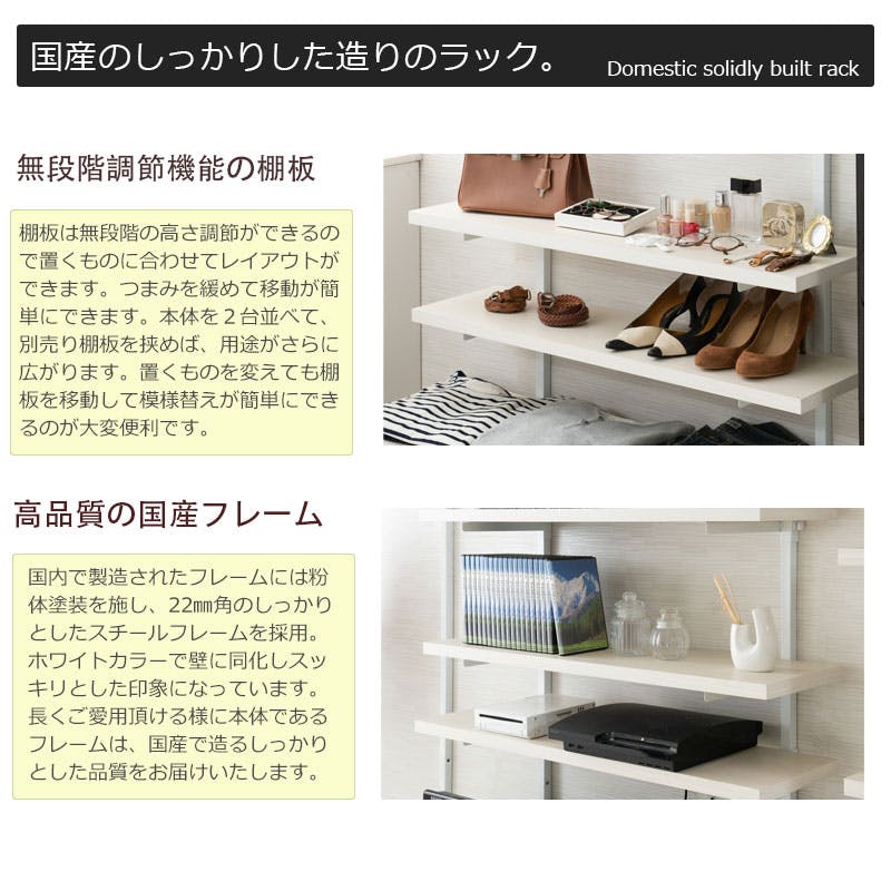 ■商品サイズ/本体:(約)幅59.5×奥行29(棚板25・脚部18)×高さ210~275(地面~最高棚設置位置200)cm■棚板:(約)幅59.5×奥行25cm■耐荷重量/棚板:(約)5kg■棚板/可動式2枚■商品重量/(約)9kg■日本製■お客様組立品 (組立時間約30分)