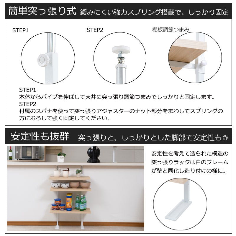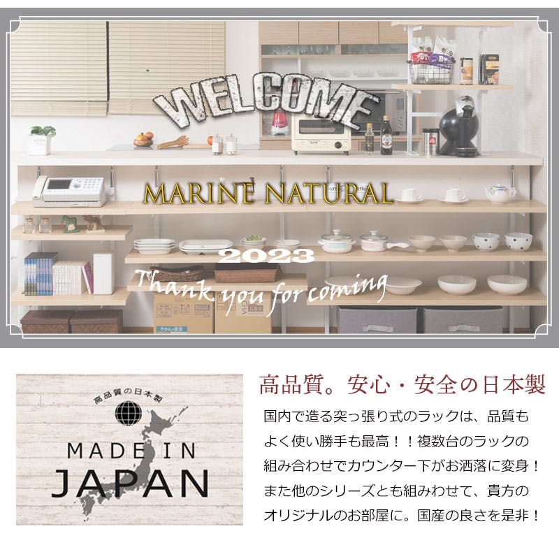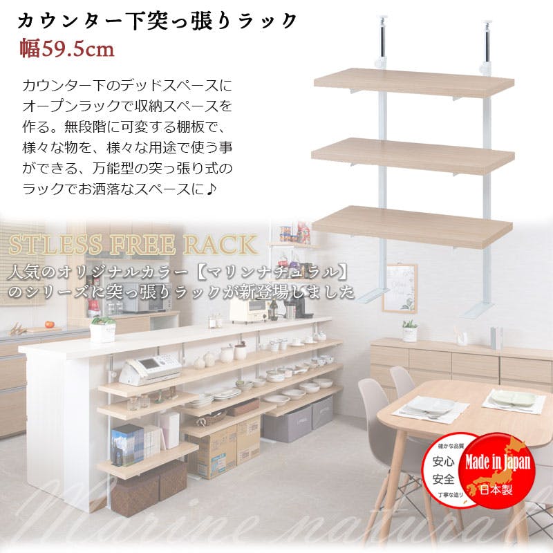 【BALE】 ベールシリーズ カウンター下ラック 無段階調整3枚棚オープンラック 本体 幅59.5cm マリンナチュラル キッチン キッチン収納 ラック 棚 突っ張り つっぱり棚 つっぱりラック 収納棚 収納ラック オープンラック おしゃれ