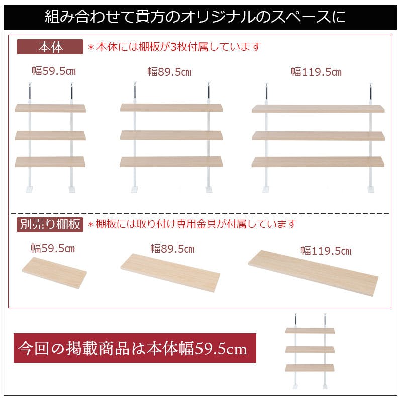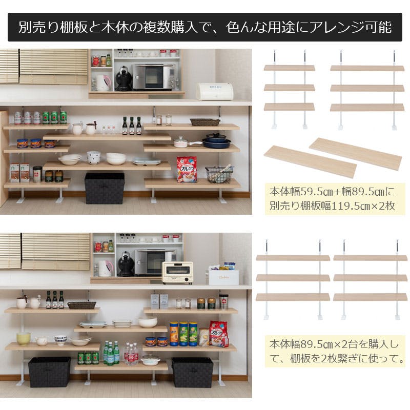 ■商品サイズ/本体:(約)幅59.5×奥行29(棚25)×高さ85~112cm■棚板:(約)幅59.5×奥行25cm■耐荷重量/棚板:(約)5kg■棚板/可動式3枚■商品重量/(約)7kg■日本製■お客様組立品 (組立時間約30分)