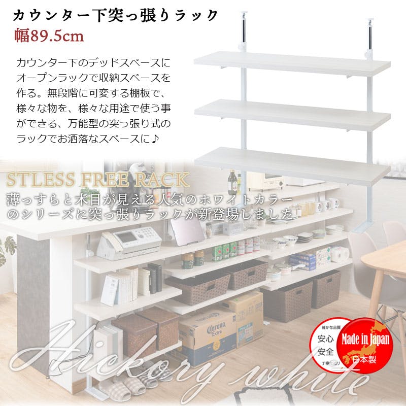 【BALE】 ベールシリーズ カウンター下ラック 無段階調整3枚棚オープンラック 本体 幅89.5cm ホワイトウォッシュ キッチン キッチン収納 ラック 棚 突っ張り つっぱり棚 つっぱりラック 収納棚 収納ラック オープンラック おしゃれ