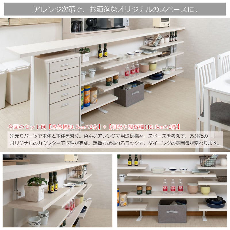 • 【BALE】 ベールシリーズ カウンター下ラック 無段階調整3枚棚オープンラック 本体 幅89.5cm ホワイトウォッシュ キッチン キッチン収納 ラック 棚 突っ張り つっぱり棚 つっぱりラック 収納棚 収納ラック オープンラック おしゃれ