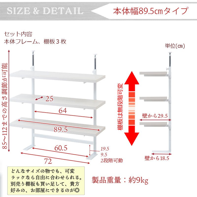 ■商品サイズ/本体:(約)幅89.5×奥行29(棚25)×高さ85~112cm■棚板:(約)幅89.5×奥行25cm■耐荷重量/棚板:(約)5kg■棚板/可動式3枚■商品重量/(約)9kg■日本製■お客様組立品 (組立時間約30分)
