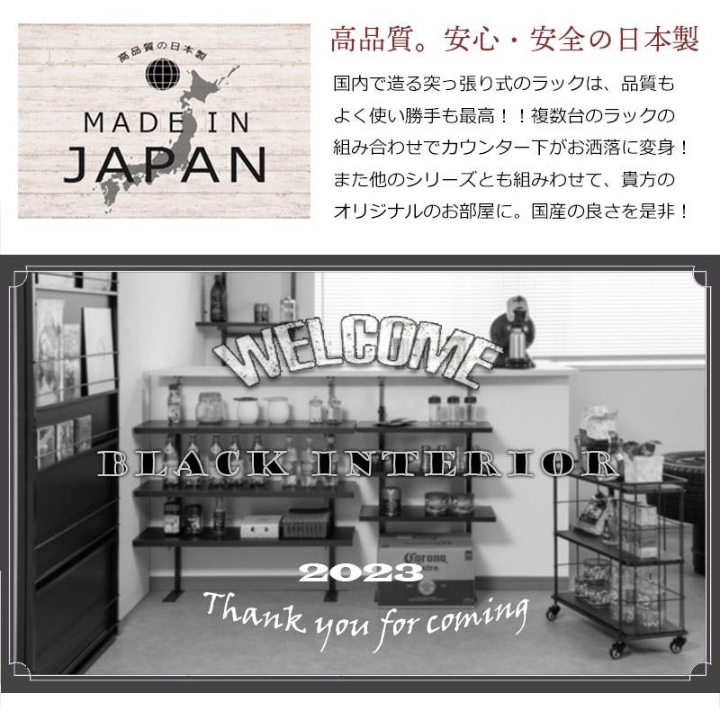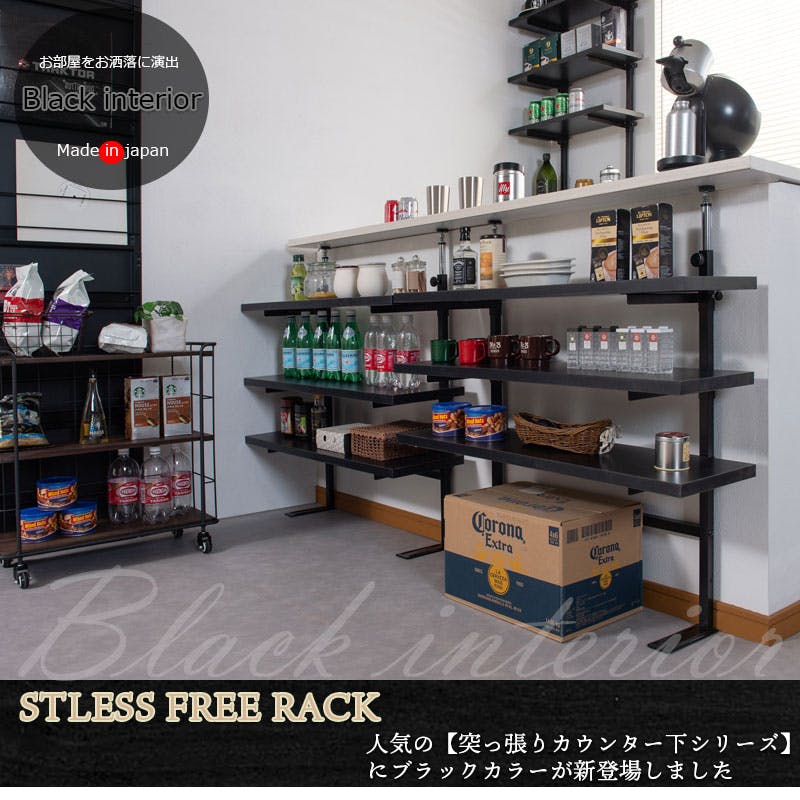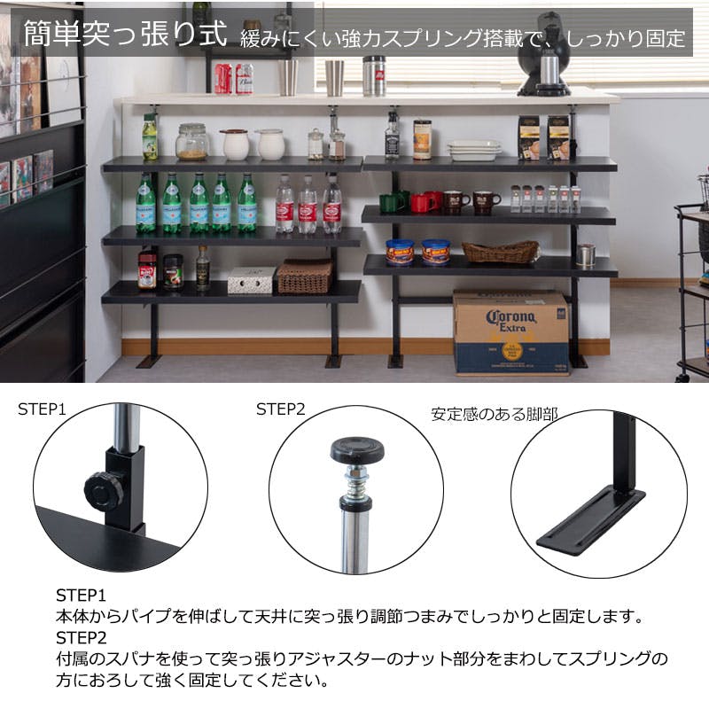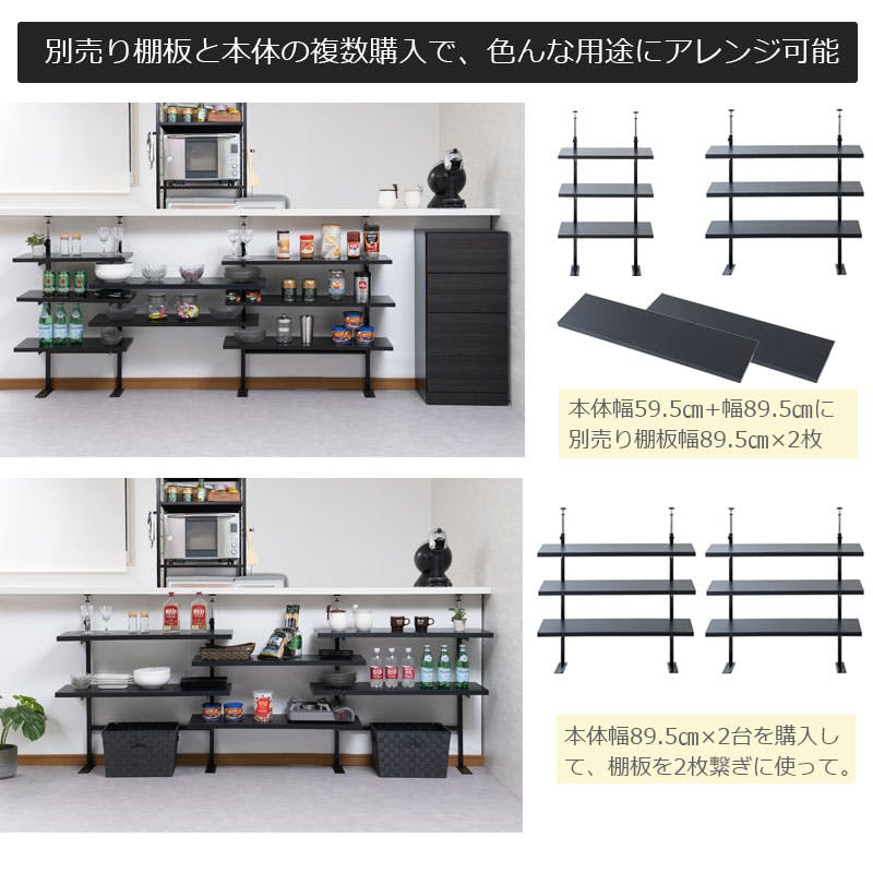 【bravo】 ブラボーシリーズ カウンター下ラック 無段階調整3枚棚オープンラック 本体 幅89.5cm ブラック キッチン キッチン収納 ラック 棚 突っ張り つっぱり棚 つっぱりラック 収納棚 収納ラック オープンラック おしゃれ