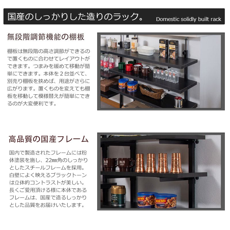 ■商品の仕様/フレーム:スチール(エポキシ樹脂粉体塗装)、棚板:プリント紙化粧繊維板