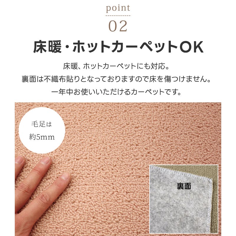 くつろぎと安心を あなたの暮らしに。抗菌・防ダニ加工の多機能な日本製カーペット。【おすすめポイント】防ダニ加工・抗菌加工、床暖・ホットカーペットOK、遊び毛が出にくい