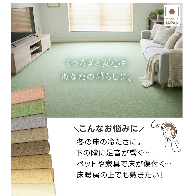 くつろぎと安心を あなたの暮らしに。抗菌・防ダニ加工の多機能な日本製カーペット。【おすすめポイント】防ダニ加工・抗菌加工、床暖・ホットカーペットOK、遊び毛が出にくい