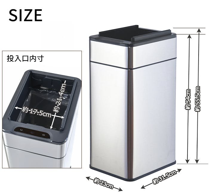 センサーの上部に手をかざすだけで蓋が自動開閉する、センサー式のダストボックス。両手が塞がっていても、ゴミ箱に触れずにゴミを捨てることができます。匂いを巻き上げにくい新しい開閉方式「格納式両開き蓋」を採用。ステンレス製のスタイリッシュでスリムなデザインは、どんな場所にもオススメ。本体は上品なヘアライン仕上げ。指紋や手の跡が付きにくい加工になっているのでお手入れも簡単です。電池式のコードレスなので、使用場所を選ばずどこでも手軽にお使いいただけます。※センサーの上部は30cmの空間が必要です。