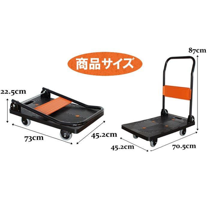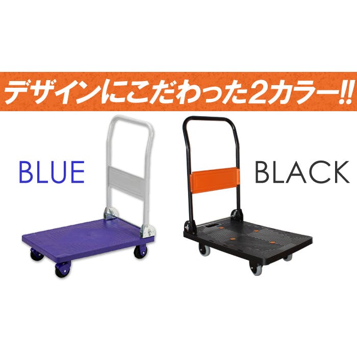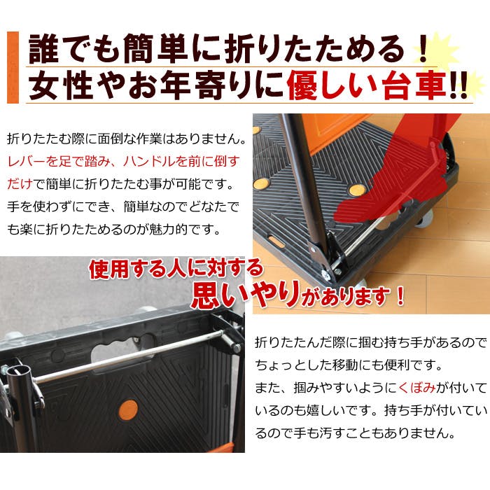 うるさくない静音設計で、ラジアルボールベアリングを採用した台車です。大きな走行音を抑え、静かに荷物を運搬できます。使わない時は折りたたんでコンパクトに収納可能。荷台手前のレバーを足で踏み、ハンドルを前に倒すだけで簡単に折りたためます。折りたたみ後も持ち運びやすいよう、荷台には手掛かり用のくぼみを設けています。また、荷台には滑り防止用のゴムを装備し、運搬中の荷物のズレを防止。スムーズで快適な作業をサポートします。