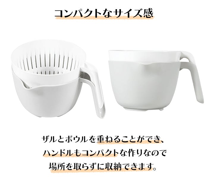 電子レンジでそのまま使える便利な持ち手付きザルボウルセット。おしゃれで機能的なデザインに加え、扱いやすいサイズ感で毎日の調理を快適にしてくれます。両側に注ぎ口が付いているので水切りや移し替えもスムーズに行え、お米とぎにも活躍。下ごしらえから加熱までこれひとつで完結する、忙しい日々に活躍するアイテムです。