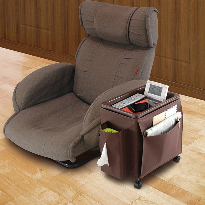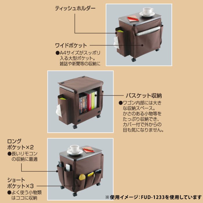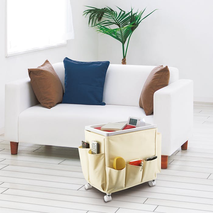 ソファやベッド・テーブル周りにぴったりな、バスケット付きのサイドワゴンです。サイドポケットやA4サイズが入る大型収納スペースつきで、小物やさかばるものもひとまとめに片づけられます。キャスター付きなので移動もラクラクです。