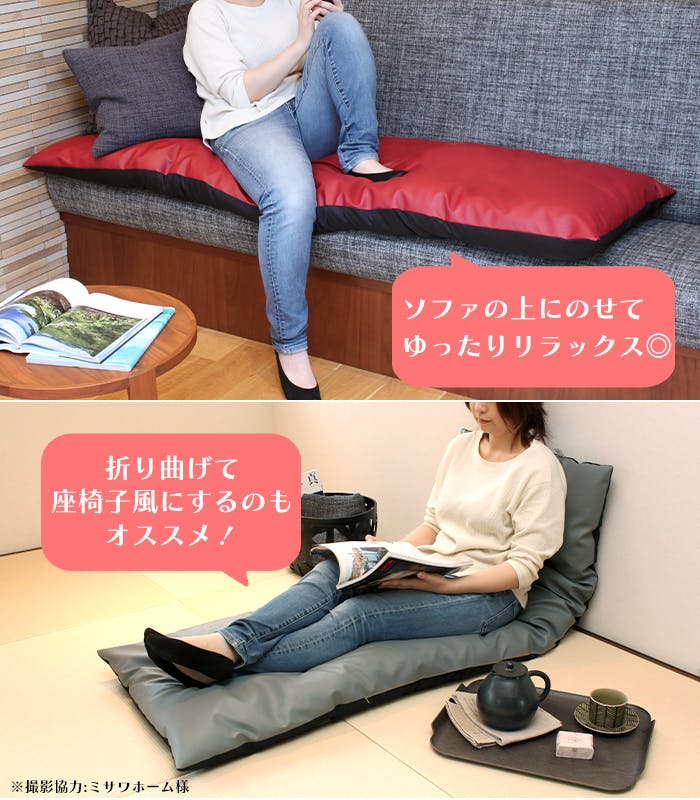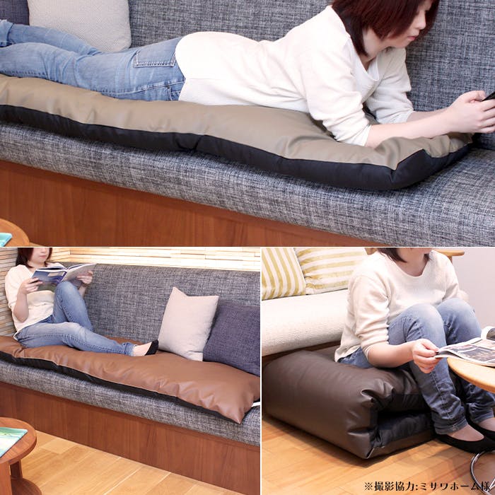高級感のある合皮レザーを使用した長座布団カバーとヌードクッションのセットです。長さ180cmで一人はもちろん、二人でもゆったり座れるロングサイズの長座布団です。ファスナー付きで長座布団の出し入れも容易です。水や汚れに強レザー素材を使用しているので、飲み物や食べ物をこぼしてもサッと拭き取ることができます。(カバーの裏面は黒のナイロン系生地となっております。)