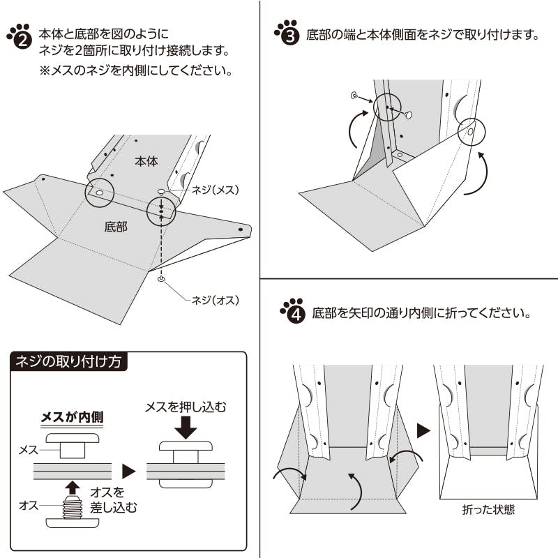 1. 本体と底部の折り目に沿って折ってください。2. 本体と底部を、ネジを2箇所に取り付け接続します。※メスのネジを内側にしてオスを差し込んだ後、メスを押し込んでください。3. 底部の端と本体側面をネジで取り付けます。4. 底部を内側に折ってください。5. 本体左右を折り、8箇所にネジを取り付けます