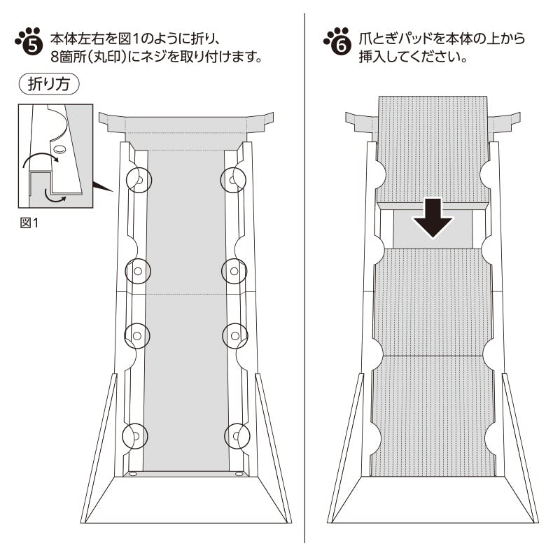 6. 爪とぎパッドを本体の上から挿入してください。7. 本体上部を内側に折り、左右にある差込口に差込部を差し込んでください。8. 完成したら、壁に設置してください。※爪とぎパッドは上下・裏表を消耗に応じて入れ替えてください。