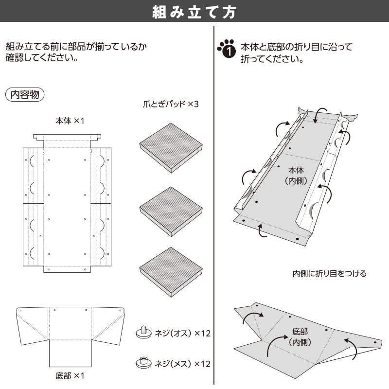 ●本品に無理な力をかけたり、乗ったりすると破損の原因となりますので注意してください。●使用中、ネジを幼児やペットが誤飲しないよう、ネジのゆるみや脱落がないか注意してください。ゆるんでいたり外れている場合は再度ネジを取り付けてください。●ペットの尿がかかると本品の強度が損なわれたり、臭いの原因となります●使用後のかきクズは早めに掃除機等で吸い取ってください●本品は室内用です。屋外では使用しないでください●用途以外には使用しないでください●猫によっては本品を気に入らず、本品を使用しない場合があります