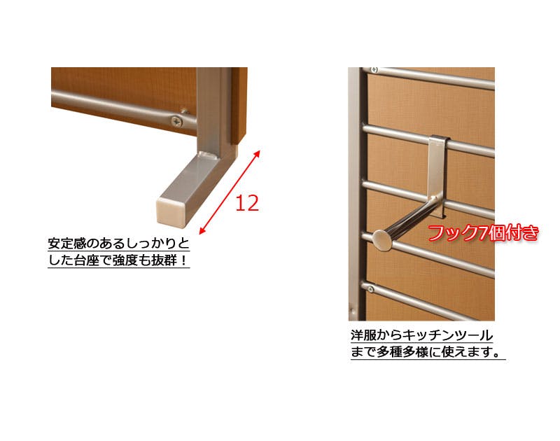■商品サイズ/サイズ:(約)幅90×奥行き12×高さ202〜260cmバックボード:(約)幅90×高さ180×厚み2cmフック可動間隔 :(約)7.5cmフック出幅:(約)14cm付属品:フック7個