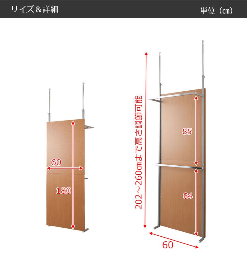 ■商品サイズ・:(約)幅60×奥行32×高さ202〜260cmハンガー部収納内寸 :(約)幅53×奥行(上)27.5(下)×高さ(上)85(総高171)(下)84cm