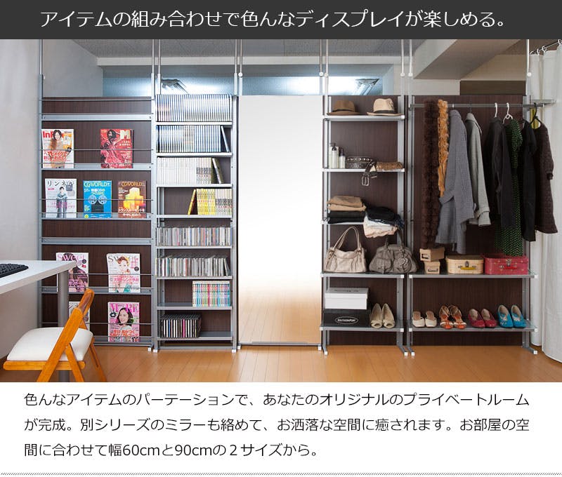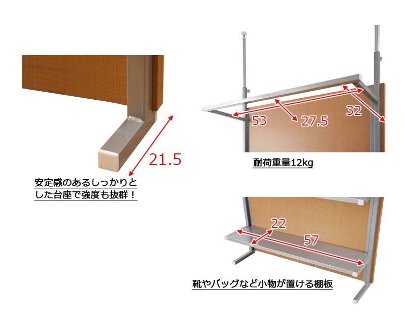 ■商品サイズ/本体:(約)幅60×奥行32(脚部21.5)×高さ202〜260cm、棚板:(約)幅57×奥行22cm、棚間隔 :(約)33.5cm、ハンガー下高さ:(約)113cm、目隠し部高さ:(約)182cm■耐荷重量/ハンガー10kg、棚:3kg■商品重量/約16kg■日本製■組立品