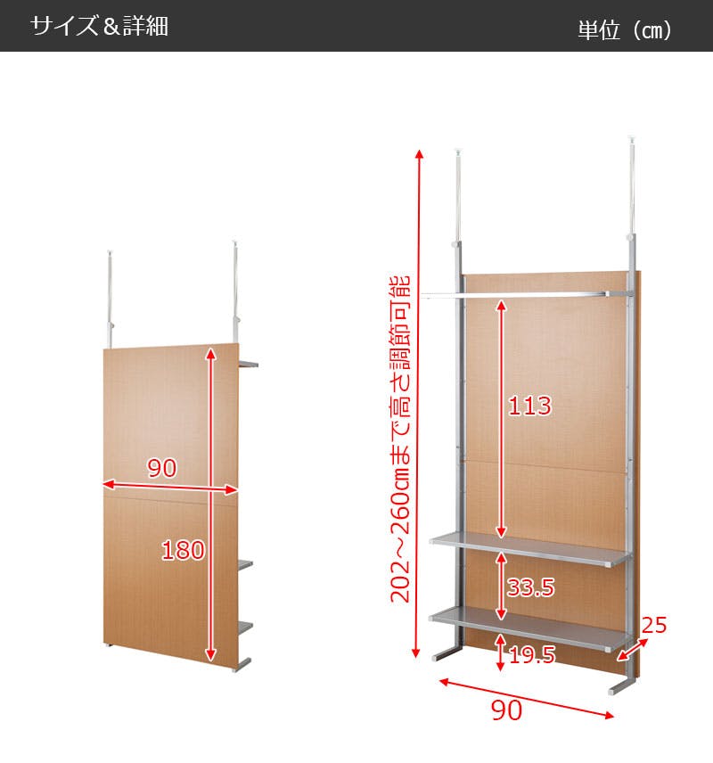 ■商品サイズ/本体:(約)幅90×奥行32(脚部21.5)×高さ202〜260cm、棚板:(約)幅87×奥行22cm、棚間隔 :(約)33.5cm、ハンガー下高さ:(約)113cm、目隠し部高さ:(約)182cm■耐荷重量/ハンガー12kg、棚:3kg■商品重量/約19kg■日本製■組立品