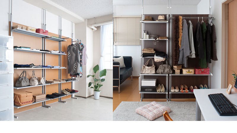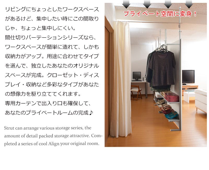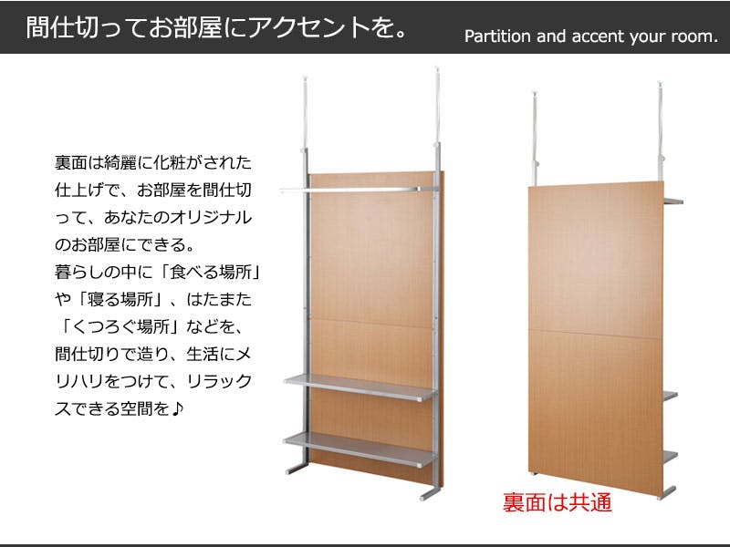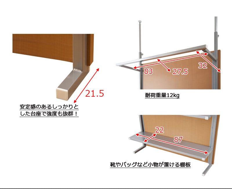 ■商品サイズ/本体:(約)幅90×奥行32(脚部21.5)×高さ202〜260cm、棚板:(約)幅87×奥行22cm、棚間隔 :(約)33.5cm、ハンガー下高さ:(約)113cm、目隠し部高さ:(約)182cm■耐荷重量/ハンガー12kg、棚:3kg■商品重量/約19kg■日本製■組立品