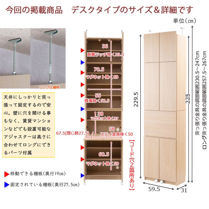 ■商品サイズ/本体:(約)幅59.5×奥行31×高さ229.5(立上がり扉高さ4.5cm含む)cm、突っ張り高さ調節範囲:(通常アジャスター時)(約)230.5~247cm(ロングアジャスター時)(約)257.5~267cm■扉内寸:(約)幅55(蝶番除く52.5)×奥行27.5(可動棚板19)×高さ(上扉)36(耐震ラッチ除く33.5)、(中扉)70.5(マグネット除く69)、(デスク扉)38(マグネット除く37)、(下扉)60.5(マグネット除く59)