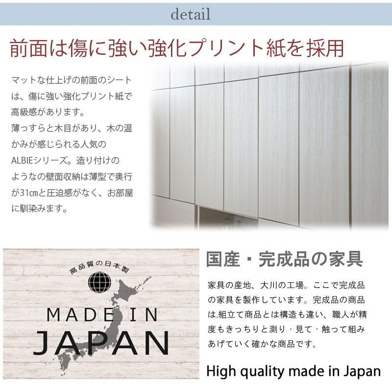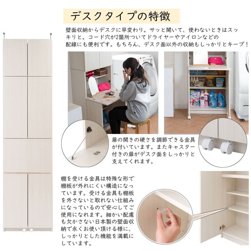 【ALBIE】 幅59.5 奥行31 壁面収納 デスクタイプ ホワイト ナチュラル 完成品 日本製 扉付き 薄型 大川家具 機能的 木目 つっぱり ウォールラック プッシュ式扉 可動棚 衣類収納 脱衣所 洗面所 壁面ラック スリム