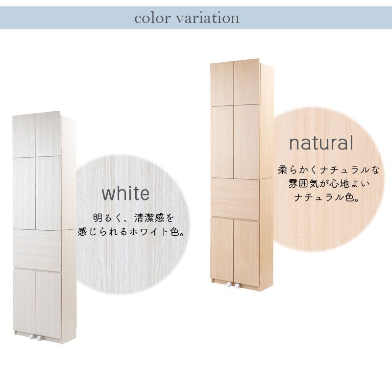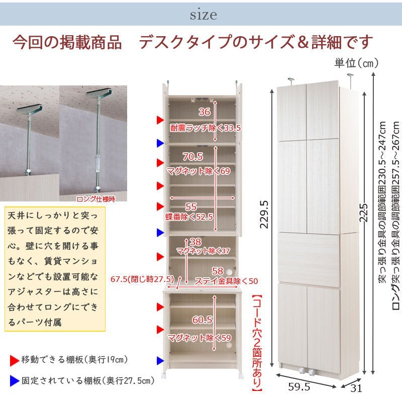 ■商品サイズ/本体:(約)幅59.5×奥行31×高さ229.5(立上がり扉高さ4.5cm含む)cm、突っ張り高さ調節範囲:(通常アジャスター時)(約)230.5~247cm(ロングアジャスター時)(約)257.5~267cm■扉内寸:(約)幅55(蝶番除く52.5)×奥行27.5(可動棚板19)×高さ(上扉)36(耐震ラッチ除く33.5)、(中扉)70.5(マグネット除く69)、(デスク扉)38(マグネット除く37)、(下扉)60.5(マグネット除く59)