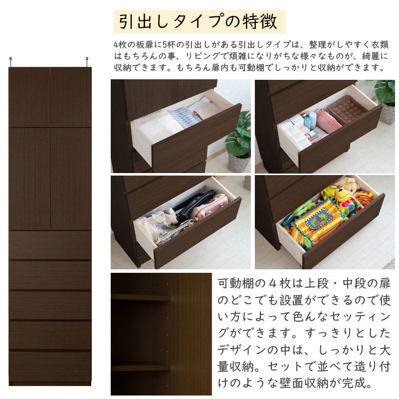 ■商品サイズ/本体:(約)幅59.5×奥行31×高さ229.5(立上がり扉高さ4.5cm含む)cm、突っ張り高さ調節範囲/(通常アジャスター時)(約)230.5~247cm(ロングアジャスター時)(約)257.5~267cm■扉内寸/(約)幅55×奥行27.5(可動棚板21)×高さ(上扉)36(耐震ラッチ除く34.5)、(中扉)70.5(マグネット除く69)cm■引出し内寸/(共通):(約)幅52.5×奥行24.5×深さ16cm
