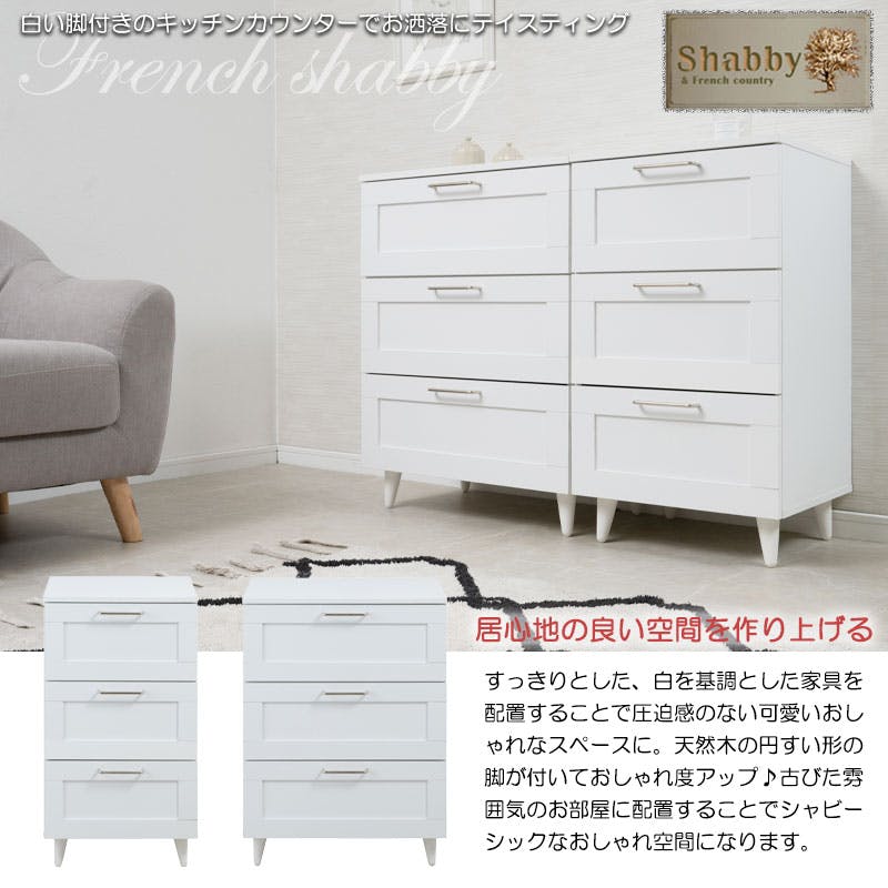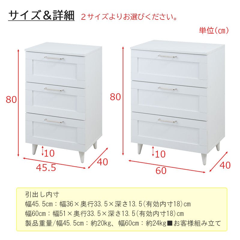 • 【WHITE LIV】使いやすい深さの枠組デザイン 3段 チェスト 全段スライドレール付き 幅45cm スリムチェストローチェスト チェスト ホワイト フレンチシャビー タンス 収納棚 ラック 木製 おしゃれ 衣類収納 たんす 引出し 引き出し 脚付き リビングボード 白
