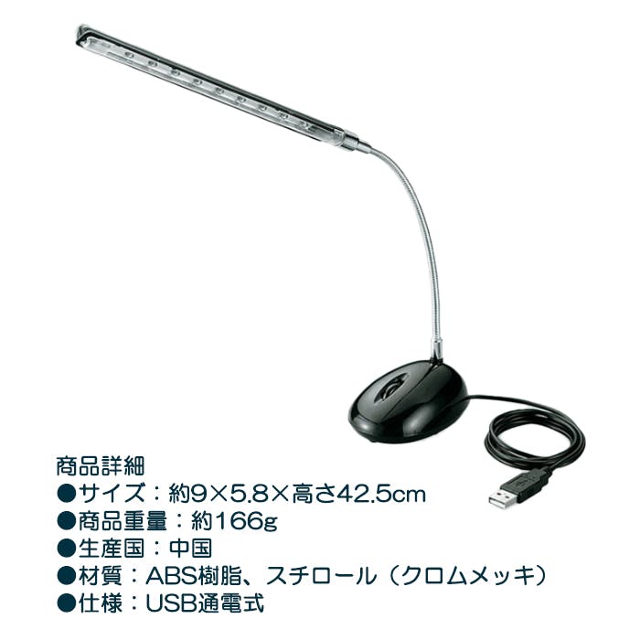 デスクの隅に置ける省スペースUSBスタンドライトです。パソコンのUSBに取り付けて、パソコン周辺を明るく照らすことができます。コンパクトなので、移動や持ち運びも簡単。