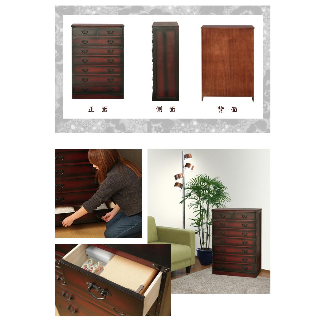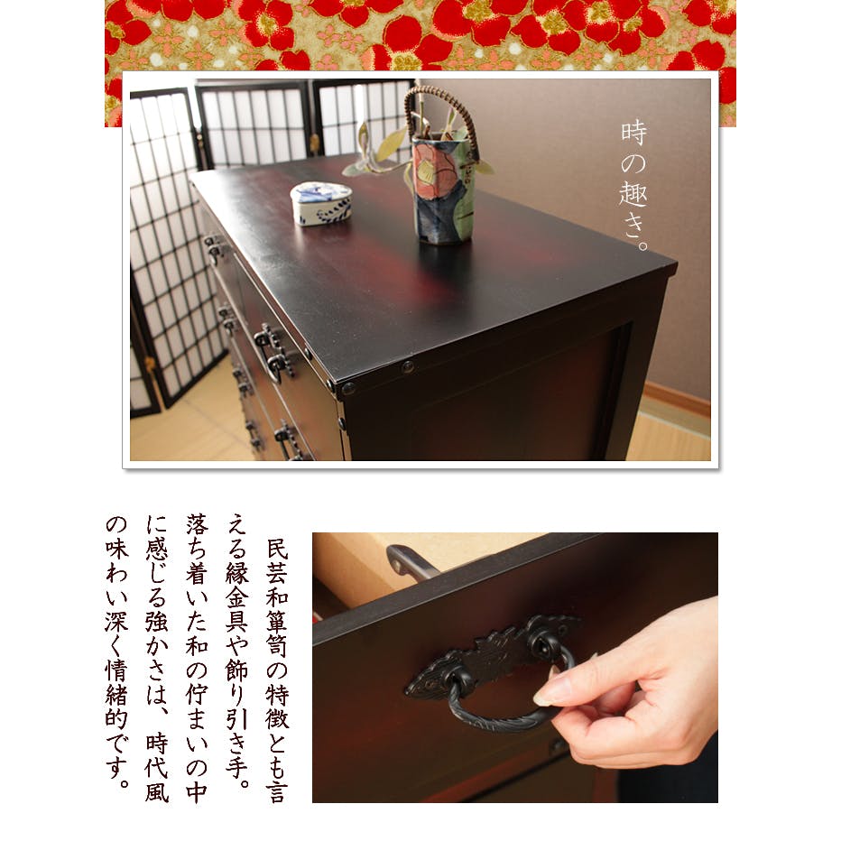 和の趣たっぷりな民芸調箪笥。手になじみやすい木製の取っ手を使用し、さらに防湿・防虫効果を生かした桐製ですので、大切な衣類の収納にぴったりです。桐は軽くて腐りにくい素材ですので、末永くお使いいただけます。
