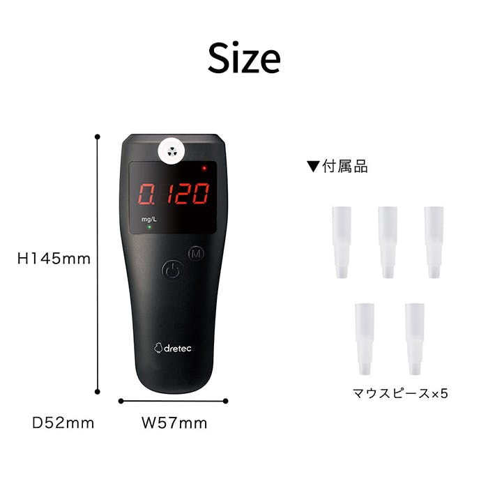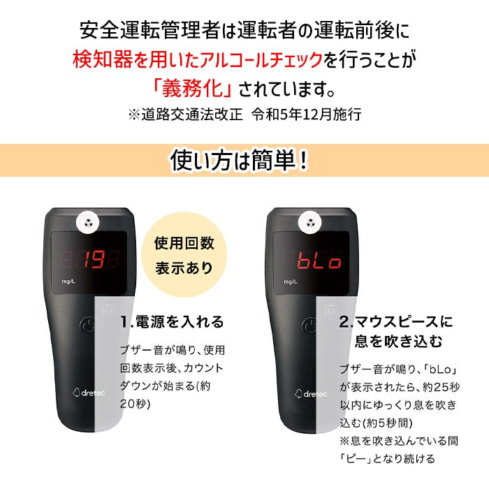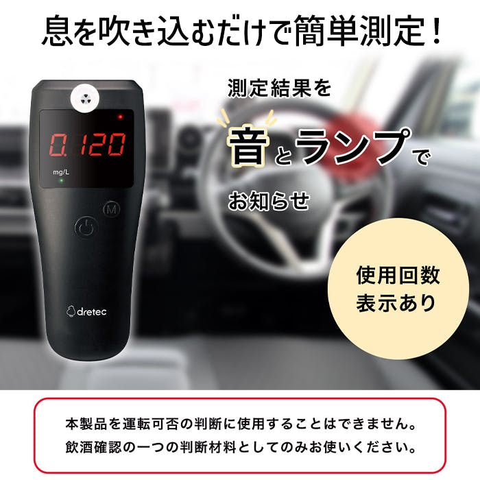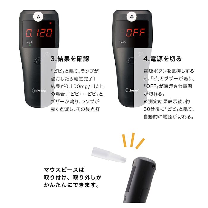 付属のマウスピースを使用して、息を吹きかけるだけで呼気中のアルコール濃度を測定できるアルコールチェッカー。測定結果を音とランプでお知らせします。測定結果が0.100mg/L以上の場合、ブザーが鳴りランプが点滅します。センサー寿命がわかりやすい使用回数表示機能付き。また、20回分の測定結果を記録できます。
