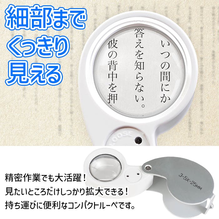 さまざまな精密作業で大活躍のLEDライト付きコンパクトルーペ。LEDライト付きで見えやすく、実倍率3-5倍と高倍率で鑑定・校正・閲覧などお仕事や肉眼ではわからない植物の観察などに最適です。簡単開閉可能&軽量で手に負荷がかかりません。