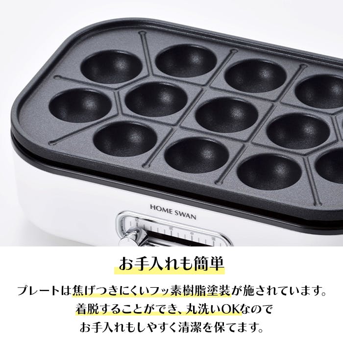 一人暮らしや二人用にぴったりのコンパクトなたこ焼き器。約A4サイズの省スペース設計で、テーブルの上でも場所を取りません。プレートは着脱式で丸洗い可能。フッ素樹脂塗装だからこびり付きにくく、お手入れも簡単です。温度調節機能付きで、調理から保温までしっかり対応。使い勝手の良さとお手入れのしやすさを兼ね備えた、便利なたこ焼き器です。