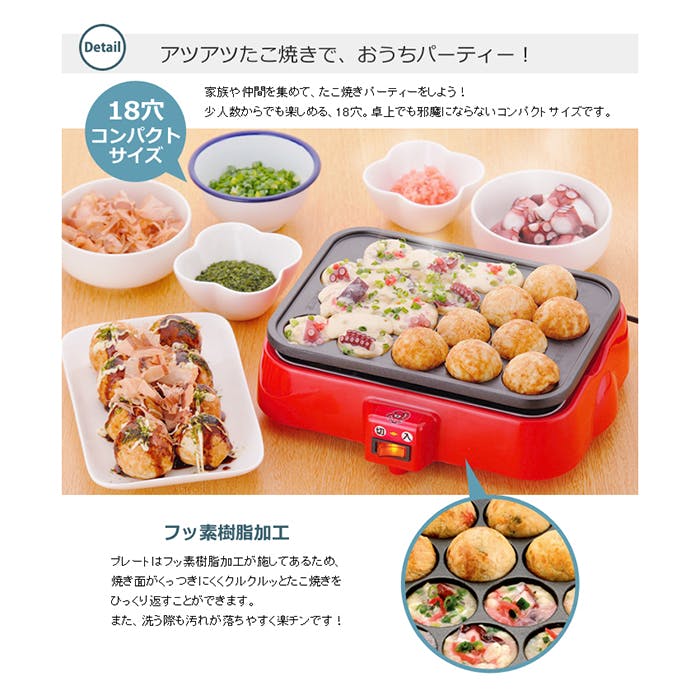 卓上に置きやすいコンパクトサイズで、たこ焼きパーティーに最適。一度に18個のあつあつたこ焼きが焼けます。パイロットランプ付きスイッチで安心。フッ素樹脂加工プレートはこびりつきにくく、着脱式で丸洗い可能。お手入れも簡単です。