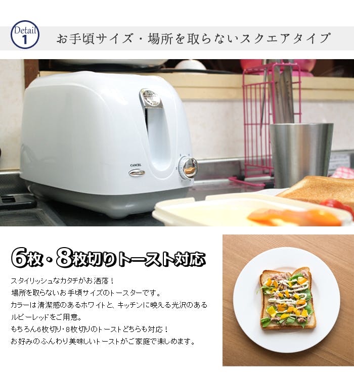 場所を取らないお手頃サイズのスクエアタイプのトースター。ふっくらトーストが2枚同時に焼けます。焼き時間を調整できるダイヤルと、焼きすぎを防ぐキャンセルボタン付きで安心。6枚切り・8枚切りトースト対応の使いやすいトースターです。