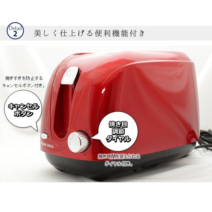 場所を取らないお手頃サイズのスクエアタイプのトースター。ふっくらトーストが2枚同時に焼けます。焼き時間を調整できるダイヤルと、焼きすぎを防ぐキャンセルボタン付きで安心。6枚切り・8枚切りトースト対応の使いやすいトースターです。