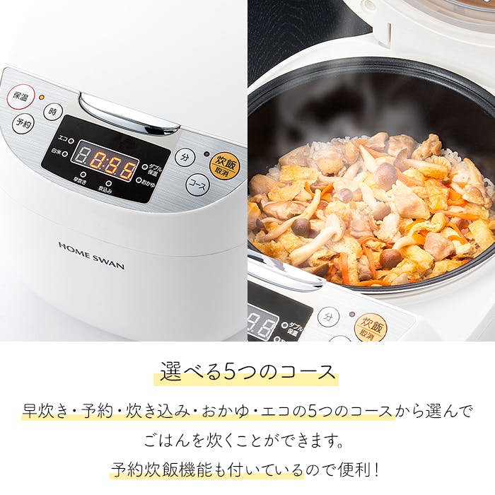 毎日使いやすい、簡単操作の5.5合炊きマイコン式炊飯ジャー。たっぷり炊ける5.5合サイズで、家族みんなのごはんも一度にしっかり炊けます。ふっ素樹脂塗装の内なべはこびりつきにくく、お手入れも簡単。内ぶた・蒸気口・内なべはすべて着脱可能で、丸洗いOK。いつでも清潔に保てます。白米・早炊き・炊込み・おかゆ・エコの5つの炊飯コースに加え、便利な予約炊飯機能も搭載。計量カップ・しゃもじ付き。