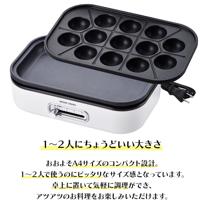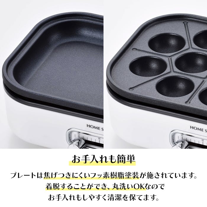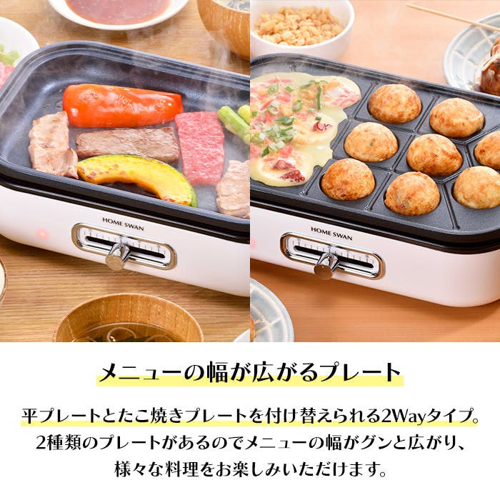 たこ焼きプレート付きのコンパクトなホットプレート。プレートは着脱式で丸洗いOK。いつでも清潔に保てます。温度調節機能付きで調理から保温まで幅広く対応。たこ焼きプレート付きで、手軽にたこ焼きパーティーも楽しめます。平プレートは焼肉やお好み焼きなど、幅広いメニューに活躍します。