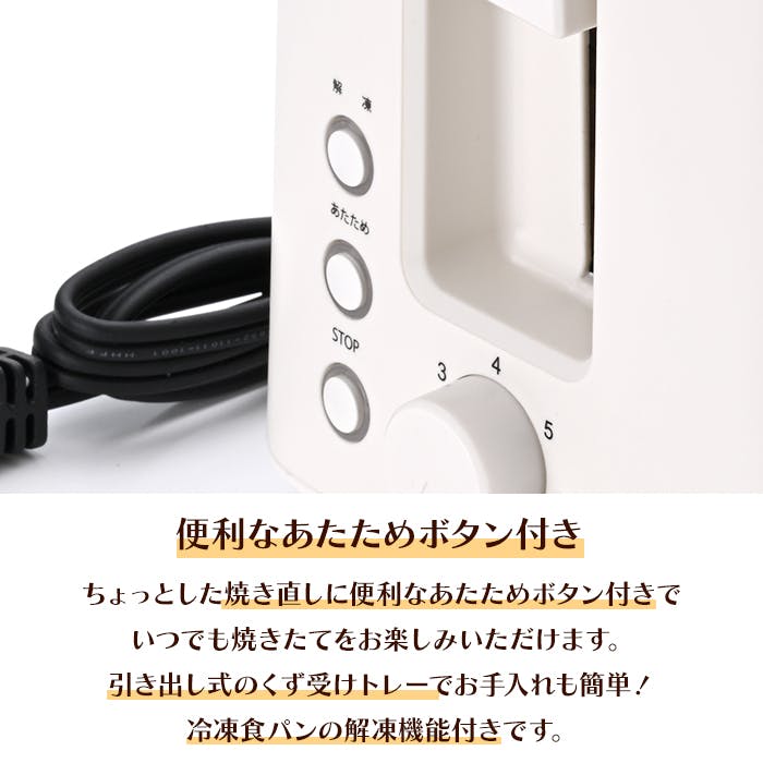 毎日使いたくなるデザインと機能性を兼ね備えた、シンプル設計のトースター。5~8枚切りの食パンに対応し、冷凍食パンもおいしく焼ける解凍機能付き(※解凍は6~8枚切り対応)。焼き加減はダイヤルで7段階調節ができ、お好みに合わせてふっくら焼き上げます。焼き直しに便利なあたためボタンや、お手入れしやすい引き出し式のくず受けトレーも搭載。毎日の朝食づくりをしっかりサポートしてくれる、頼れるトースターです。