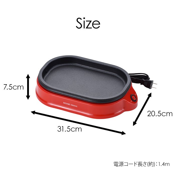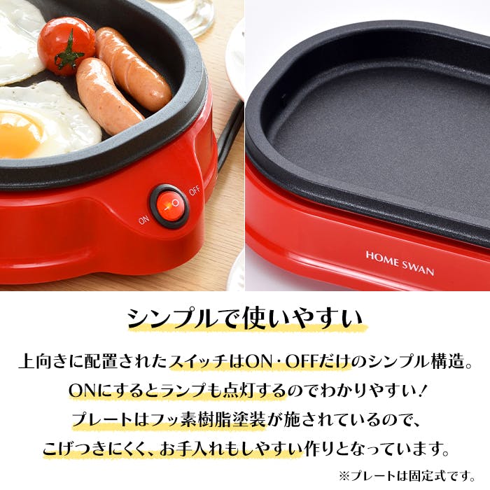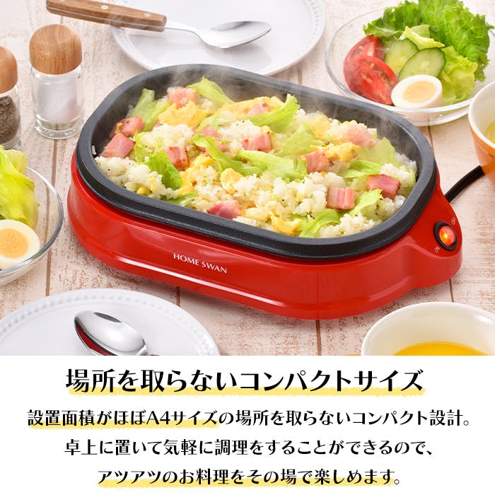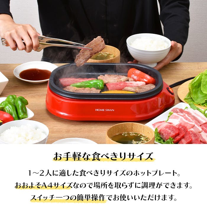 1~2人用にちょうどいいコンパクトサイズのホットプレート。A4用紙ほどのサイズで場所を取らず、ちょっと使いにも最適です。操作はシンプルなON/OFFスイッチのみの簡単操作。調理しながらアツアツの料理をそのまま楽しめます。