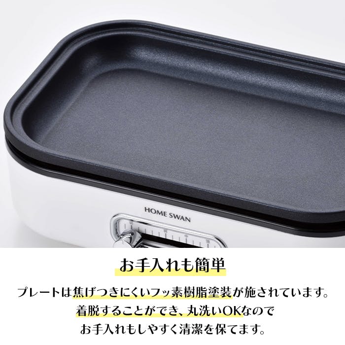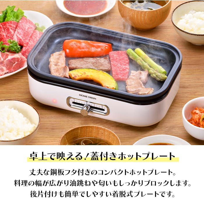 卓上でも映える、おしゃれでコンパクトなホットプレートです。着脱式プレートは丸洗いOKで、いつでも清潔に保てます。温度調節機能付きで調理から保温まで幅広く対応。鋼板フタ付きで料理の幅が広がり、油跳ねやニオイも軽減。後片付けも簡単で、食卓を汚さず快適に楽しめます。