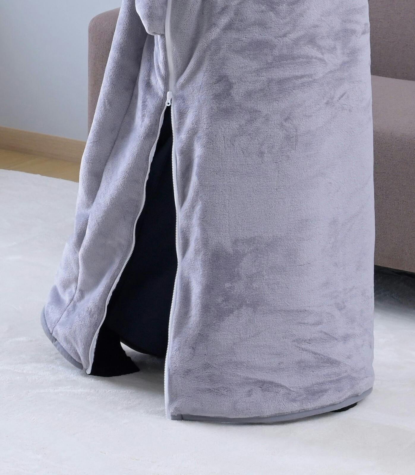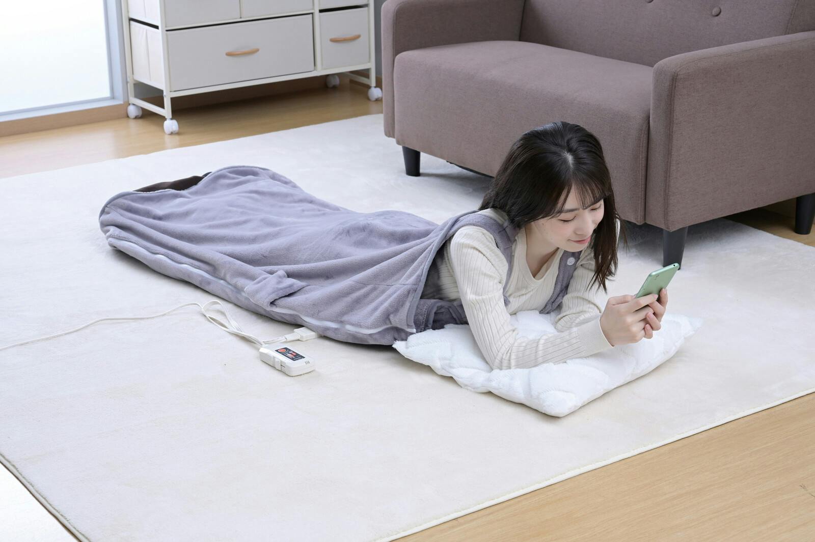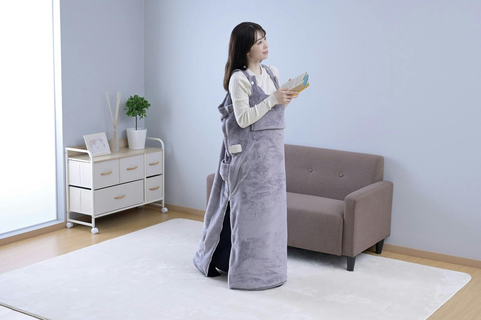 1枚3役!着たまま動ける電気毛布!! ●着脱がラクで、なで肩でもズレ落ちにくいエプロン型。肩紐で丈の調節が可能 ●こたつみたいにぽっかぽか ●2時間オフタイマー ●電源自動オフ機能 ●コントローラー付、温度無段階調節 ●コントローラーを収納できるポケット付 ●ファスナー開閉スリット入り ●着て、広げて、ごろ寝マットとしても! ●底冷えを防ぐ足ポケット付