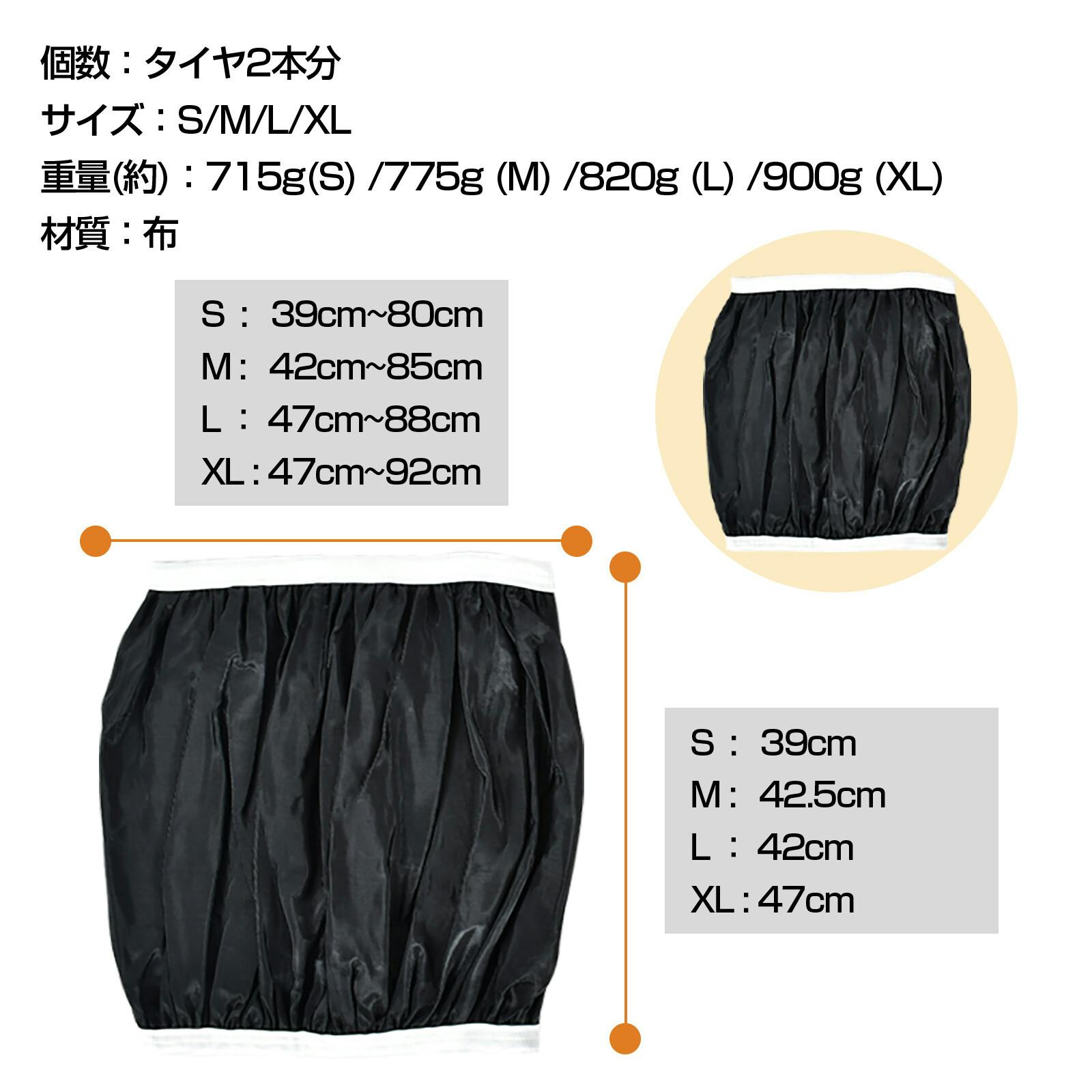 ジャッキアップ不要で楽々装着!布製タイヤチェーン ●特殊構造で積雪や凍結時の路面をがっちりグリップ!軽量で振動が少なく、ガチャガチャと音がしないので快適に運転ができます。 ●一級自動車整備士監修 ●軽量約1kg ●路面凍結時や積雪時の備えに! ●取り付け方はとってもカンタン!1.本製品を広げる、2.タイヤの上側から被せる、3.車を少し前進させ、残りの部分をしっかり被せる、4.全体の形を整えて完成 ●軽量で持ち運びも楽々! ●作業用手袋付き ●S:横約39~80cm、縦約37cm ●手洗いOK