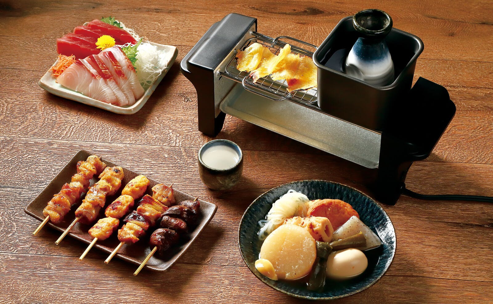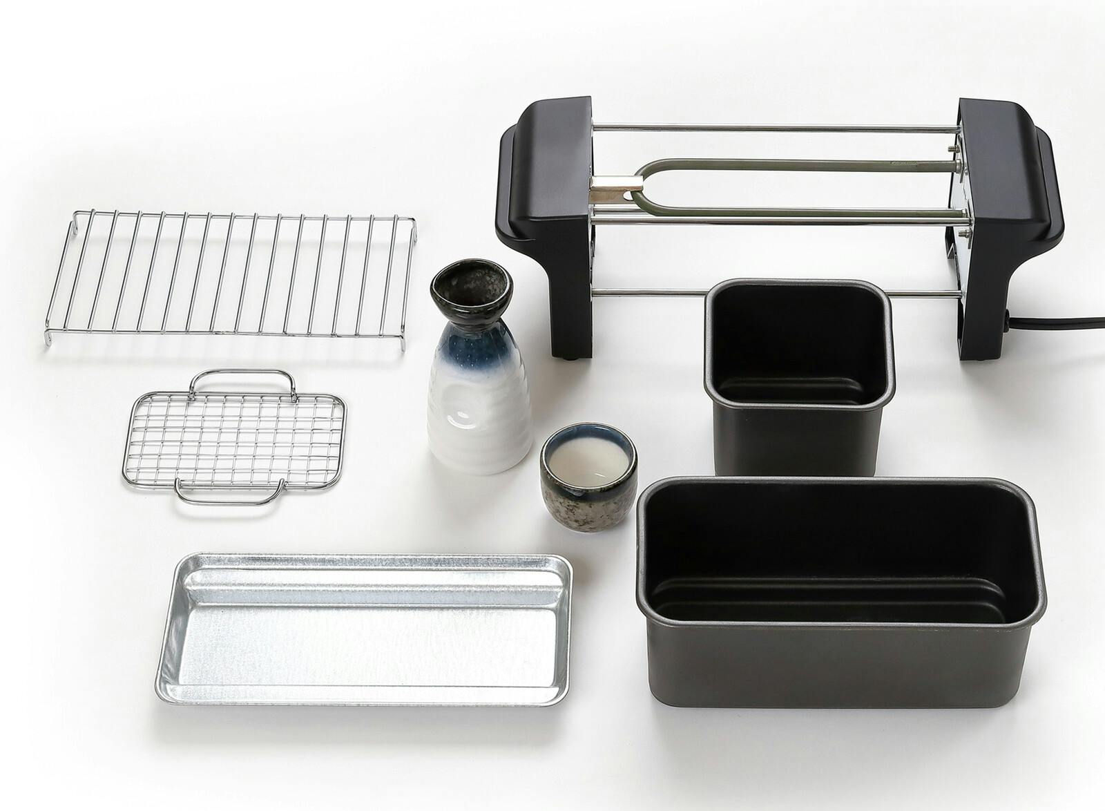 [セット内容] 本体、トレイ、焼き鳥網、炙り網、おでん鍋、熱燗鍋、とっくり、おちょこ ●1年間保証書付き