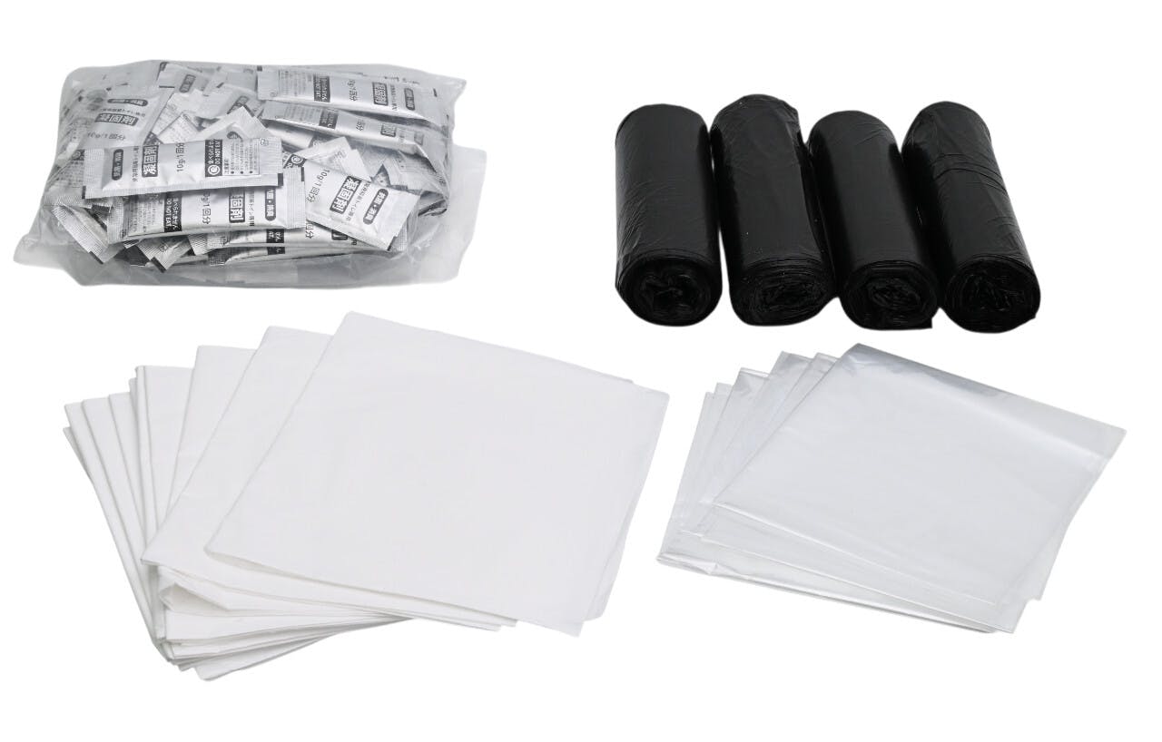 [セット内容] 凝固剤120回分、汚物袋120枚、ゴミ袋12枚、便座カバー6枚